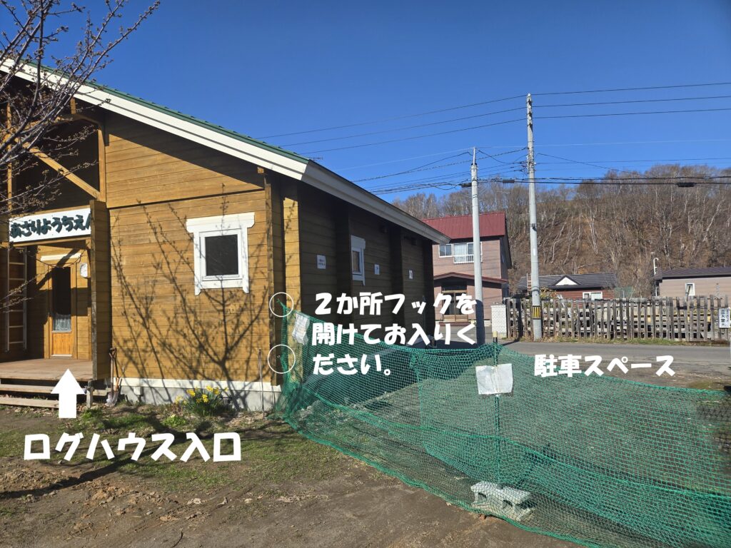 ・ログハウス入口前に園庭から園児が駐車場へ飛び出す危険を防止するために緑色のネットを張っています。ログハウスご利用の際はフックを外してお入りください。